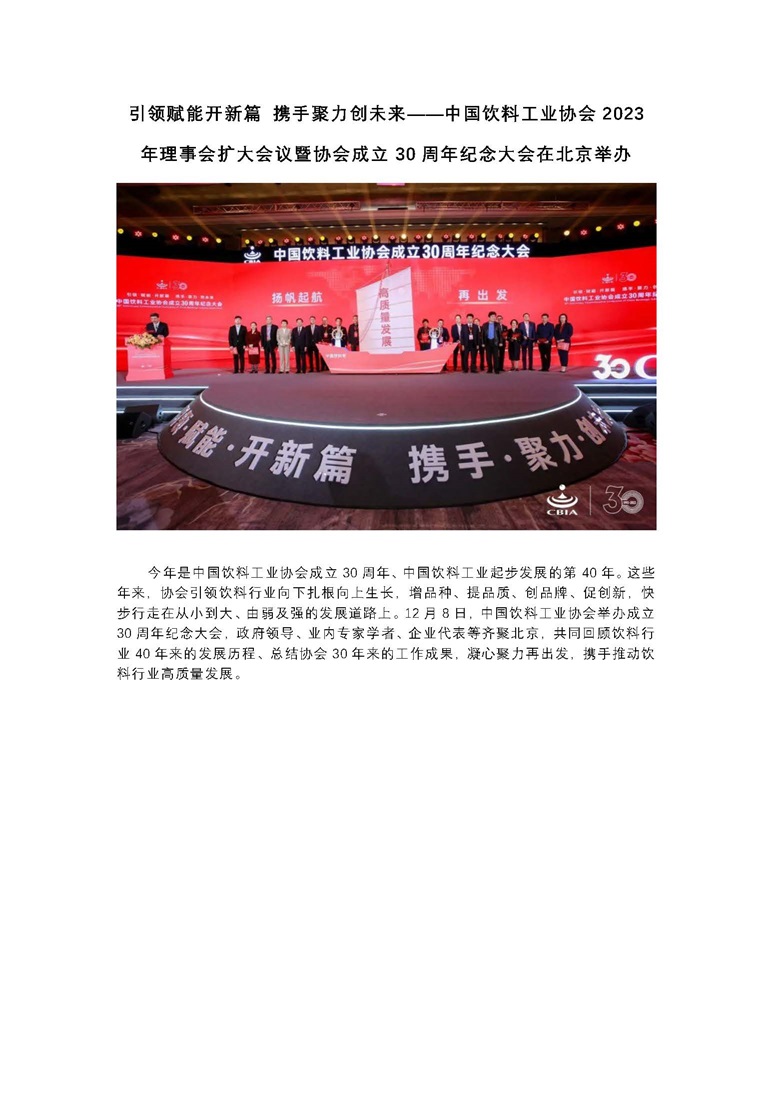 中國飲料工業(yè)協(xié)會2023年理事會擴大會議暨協(xié)會成立30周年紀念大會在北京舉辦